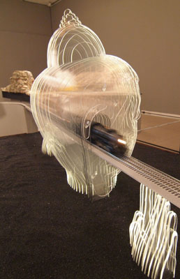 Sandor Bodo’s Trainscape installation deals with the nature of spiritual enlightenment, expressed symbolically. Multiple Buddhas, suffused with a light that radiates from within, rise from a desert of ignorance. The blissful meditation of the most fully Enlightened One is undisturbed, even by the train that roars straight through his head. This simple but powerful image underscores the powers of human concentration, and also casts light upon dualities that Buddhism and other spiritual systems seek to transcend: the temporal and the eternal, the internal and the external, and the fragile and the powerful.