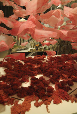 In Tickled Pink, Doug Bosch’s forms come alive with the motion of the model train. Although the locomotive disappears into the table, the rippling movement of the ethereal beings above allows the viewer to track the train’s direction. This movement reveals the symbiotic relationship between the landscape and train, for without the train the landscape lies completely static and without the landscape the train disappears. The train’s movement draws the viewer’s eyes back and forth between the quivering cloud of discs and the strikingly pink lichen (a popular material in model railroading) on the platform below. While the discs may remind the viewer of natural beings such as lily pads or jellyfish, this landscape is from another world.
