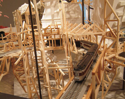 In Municipile, familiar local buildings tumble about, free of their usual static state. Chris Frost includes a variety of architectural styles as well as recognizable landmarks such as Boston’s South Station, Cambridge City Hall, and the DeCordova Museum. He chooses a different scale for each building, disengaging the connection often made between size and importance. A small Victorian house, for example, can loom above what normally would be a much larger civic building. This odd mixture of structures comments on the diversity that makes up a city or region. Because of Frost’s meticulous craftsmanship, the lack of consistent scale, and the unifying color and material, the buildings can also be interpreted as purely geometric forms dynamically arrayed on a supporting steel armature. All four O-scale Trainscape trains pass through Municipile, which acts as the rail hub for the entire exhibition. The artist has placed additional trains, of different scales, within Municipile itself. These trains add complexity to the relationships among the differently-scaled buildings and further activate the installation with their motion.