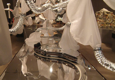Model trains distance the viewer from the power, sound, and vibrations of a real train. Robin Mandel and Gideon Webster have restored some of those sensations in Inflatable Respiring Cloudscape. The passing of the model train triggers a switch that turns on blowers which inflate the clouds. The rush of air one feels as a real train hurtles by is replaced by the breath of open vents pointed at the viewer. The blowers echo the sound of a real train. The arrival of the model train causes a transformation of materials, but the materials also transform the train from a chugging earthbound machine into an airborne flying cloud buster.