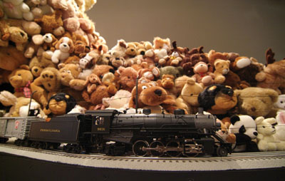 Trains can evoke a variety of emotions. For example, while on the one hand we associate model trains with children and play, real trains have a haunting history. Immigrants built the railroads in the United States under horrible conditions, and trains transported people to concentration camps during the Holocaust. These conflicting feelings are expressed by Stuart Schechter’s Plush. The pleasant innocence of youth appears in the stuffed animals and the larger form of the baby, while the penned-in toys and their menacing actions suggest the darker side of trains.