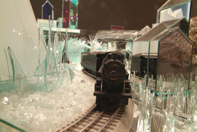 For Trainscape, the artist uses clear, frosted, and dichroic glass, mirrors, lights, and rock candy (a crystalline structure) to create a magical place where reflection and refraction shatter conventional notions of time, space, and place. The motion of the train along with its multiple images in the surrounding glass surfaces further activates the overall perceptual complexity – it seems at once here, there, and everywhere. The idea of a crystal city has loomed large in the human imagination. Wulke’s installation takes its place alongside the Emerald City of Oz, the modernist utopian architecture of Bruno Taut, the contemporary glass skyscrapers of Daniel Libeskind – and visions of heaven itself.